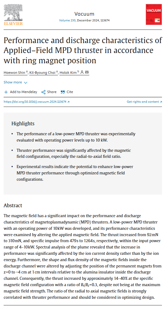 "'Performance and Discharge Characteristics of Applied-Field MPD Thruster in Accordance with Ring Magnet Position,' H. Won et al., has been accepted for publication in Vacuum (September 2024)."